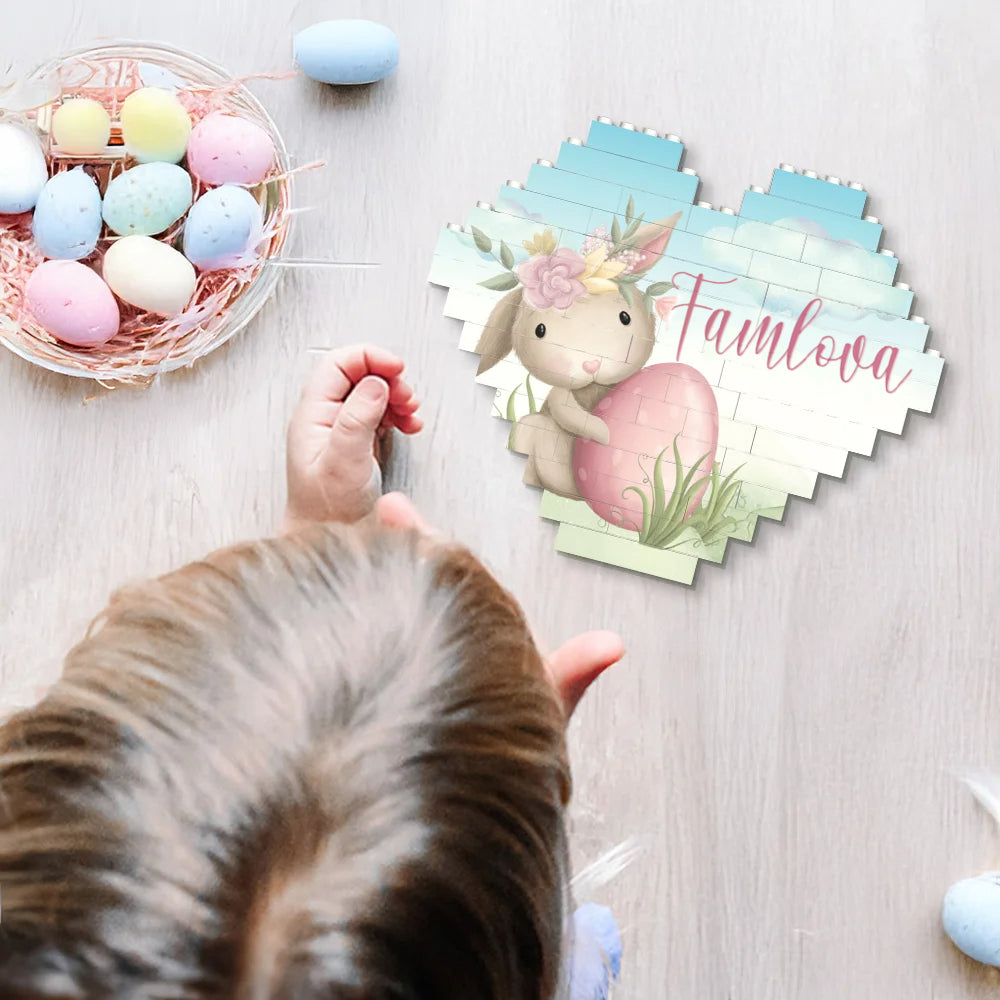 Personalised Adorable Bunny and Easter Egg Heart-Shaped Building Brick Puzzle with Name – Fun Easter Party or Birthday Gift for Kids
