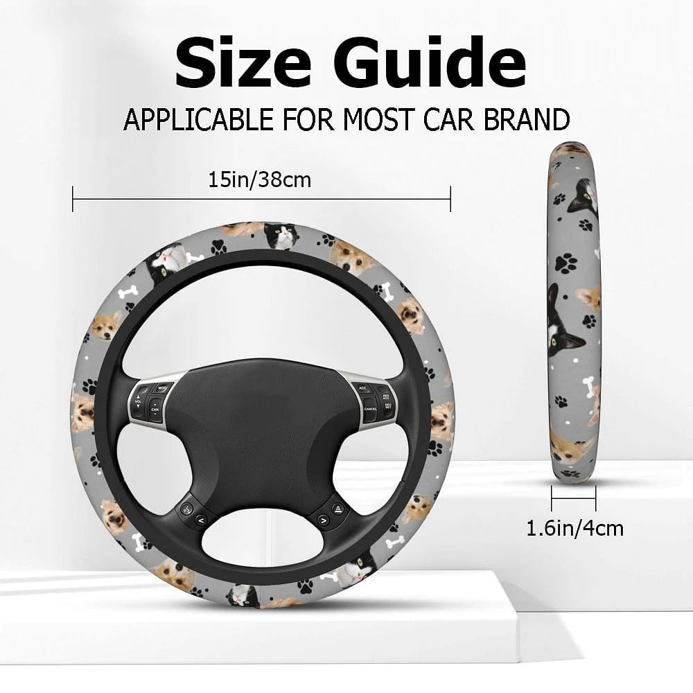 Personalised Anti-Slip Car Steering Wheel Cover with Multicolor 1–3 Pet Portrait and Paw Bone Design – Birthday Car Accessory Gift for Pet Owners