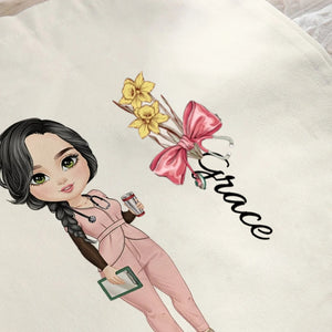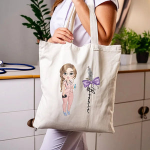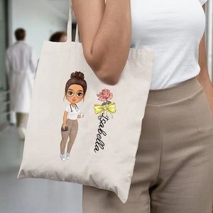 Personalised Canvas Tote Bag with Birth Flower Bow Stethoscope Cartoon Character and Name Birthday Appreciation Gift for Nurse Doctor Medical Staff
