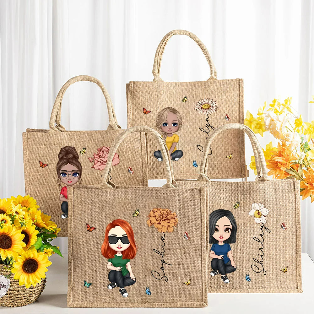 Personalised Jute Tote Bag with Name Cute Cartoon Girl Birth Flower Wedding Birthday Mother’s Day Gift for Women and Girls