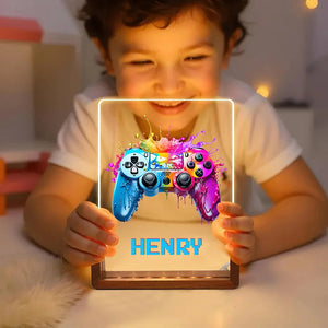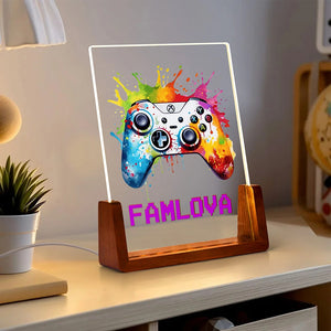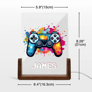 Personalised LED Night Light with Colorful Splash Ink Gamepad Design, Pixel Name and Wooden Base – Fun Nursery or Birthday Gift for Kids