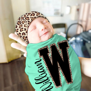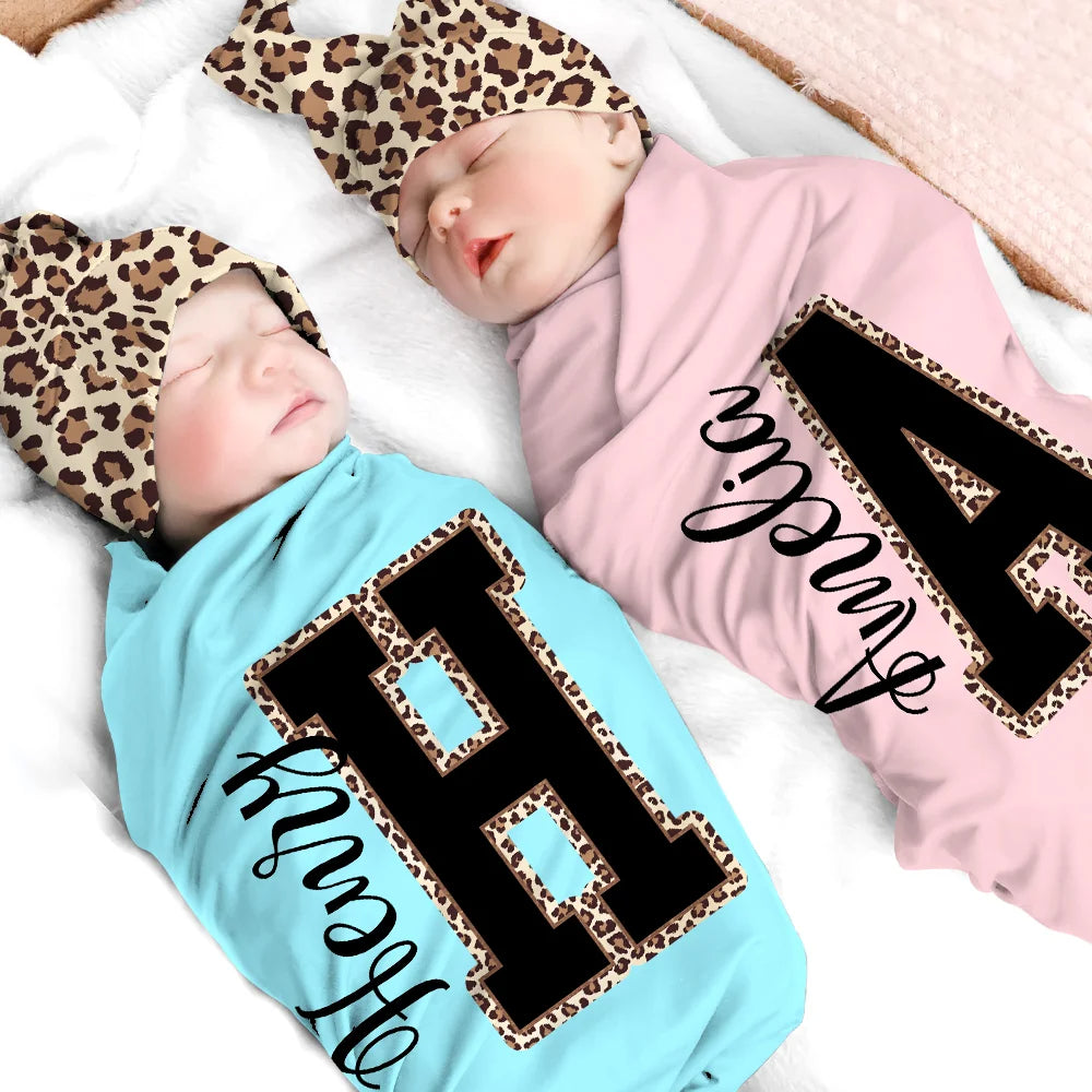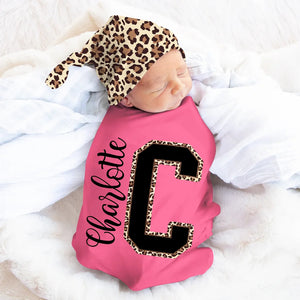 Personalised Leopard Initial Name Newborn Swaddle and Knot Hat Set 100% Cotton Baby Shower or Birthday Gift