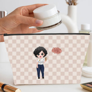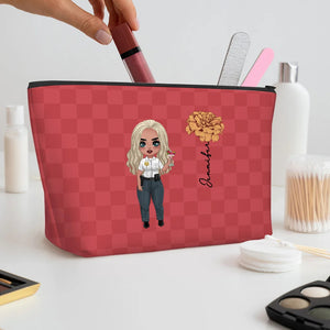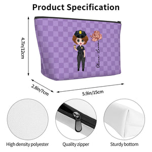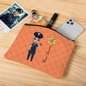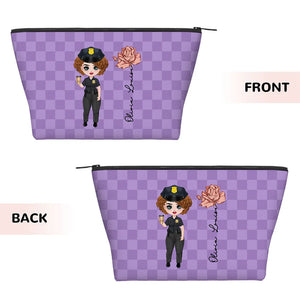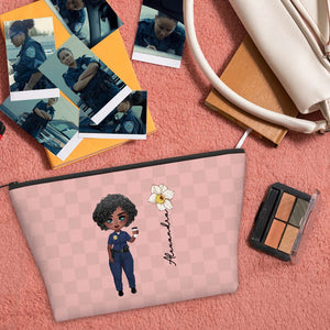 Personalised Police Woman Cartoon Character Makeup Bag with Birth Flower and Name Graduation or Birthday Gift for Female Police Officer
