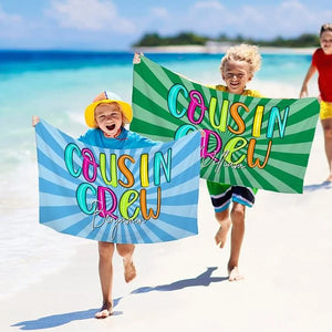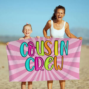 Personalised Retro Cousin Crew Ray Design Beach Towel with Name Oversized Quick-Dry Perfect Birthday or Pool Party Gift for Family