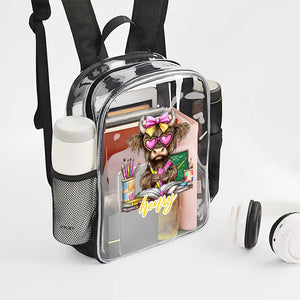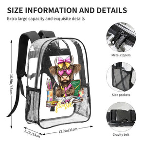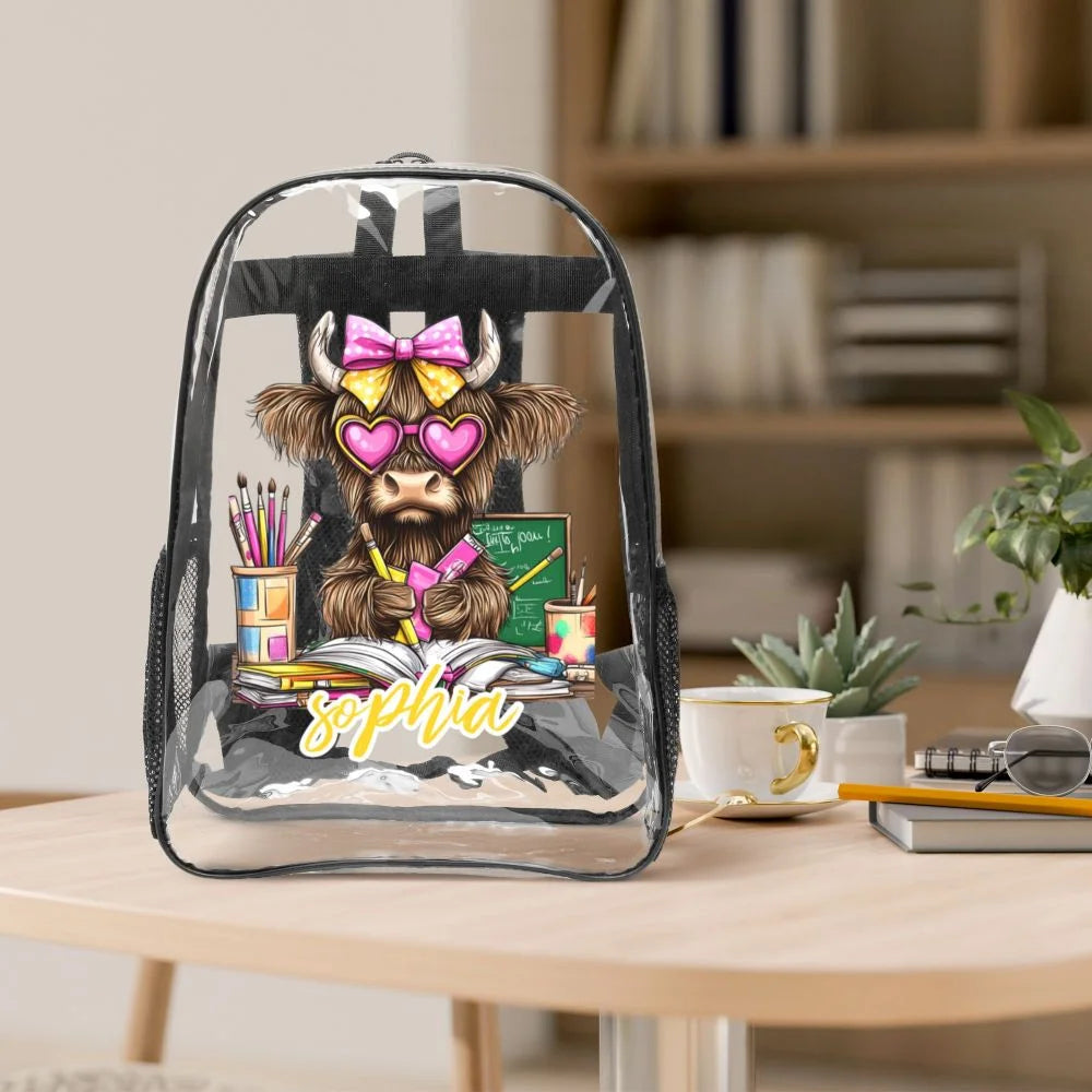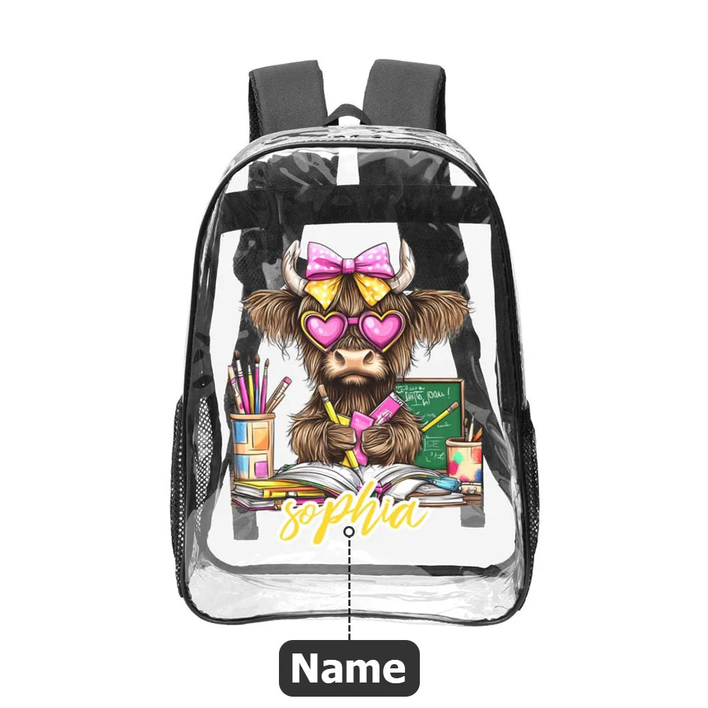 Personalised Waterproof Clear Backpack with Coquette Bow Highland Cow Design Adjustable Strap and Name Children's Day Birthday Gift for Kids