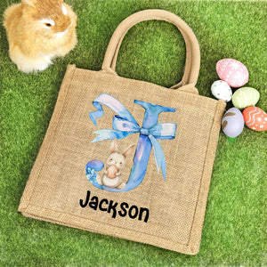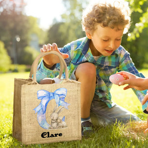 Personalized Easter Bunny & Eggs Tote Bag – Cute Bow Design with Name/Initial – Eco-Friendly Jute Shopper – Easter Party Gift for Kids, Boys & Girls, Travel Accessories