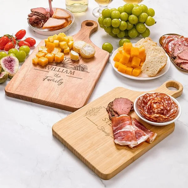 Personalized Engraved Floral Wooden Charcuterie and Cutting Board with Handle and Custom Name Wedding or Housewarming Gift for Family