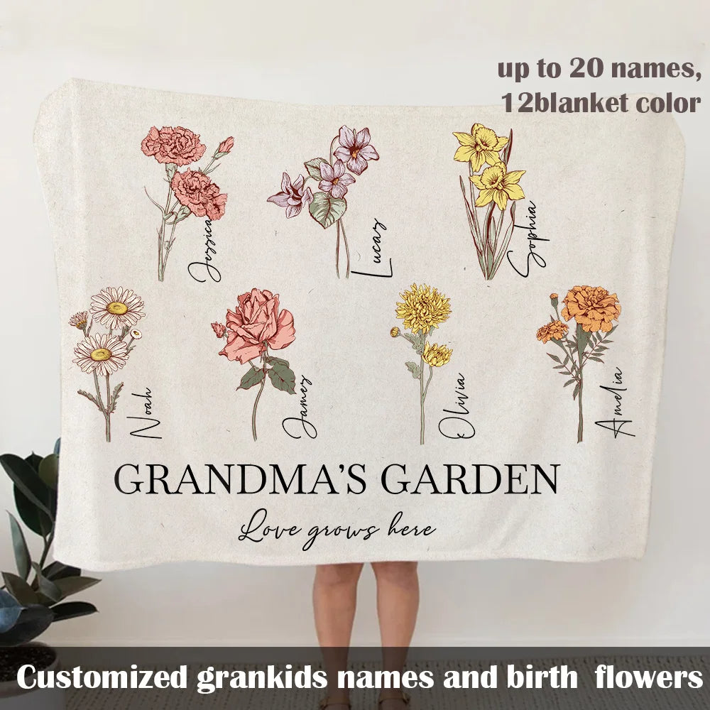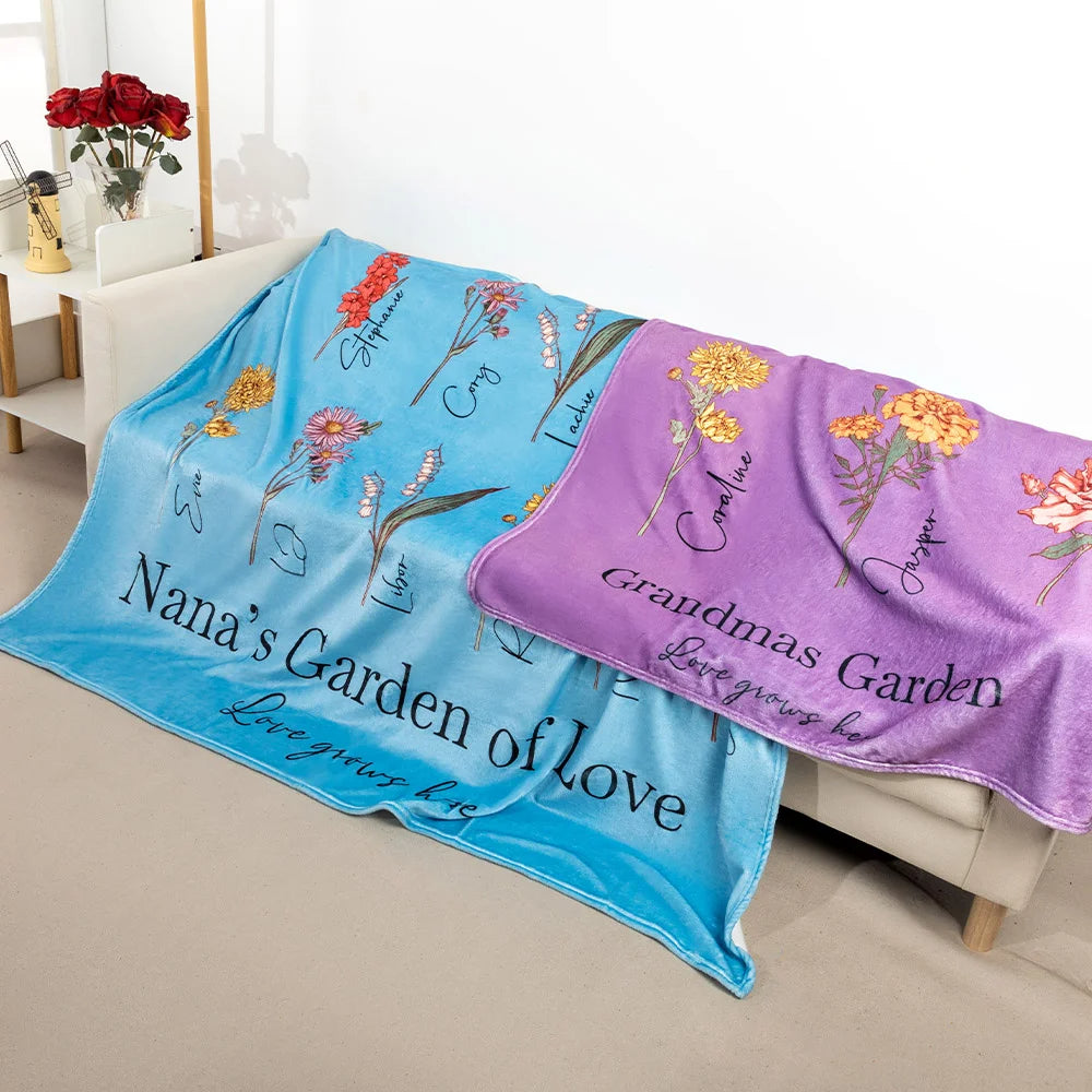Personalized Love Grows Here Fleece Blanket with Family Birth Flowers – Gift for Mom or Grandma