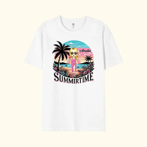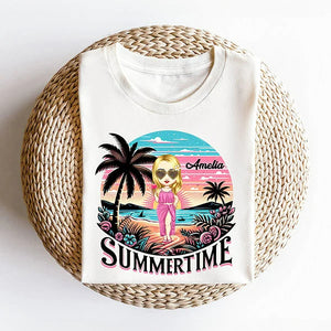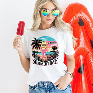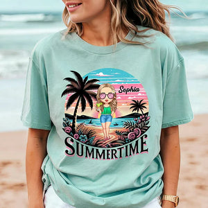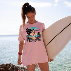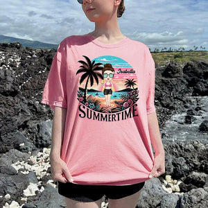 Personalized Cartoon Summertime Beach Sunset Palm Tree 100% Cotton T-shirt with Name Vacation Party Gift for Girls Women